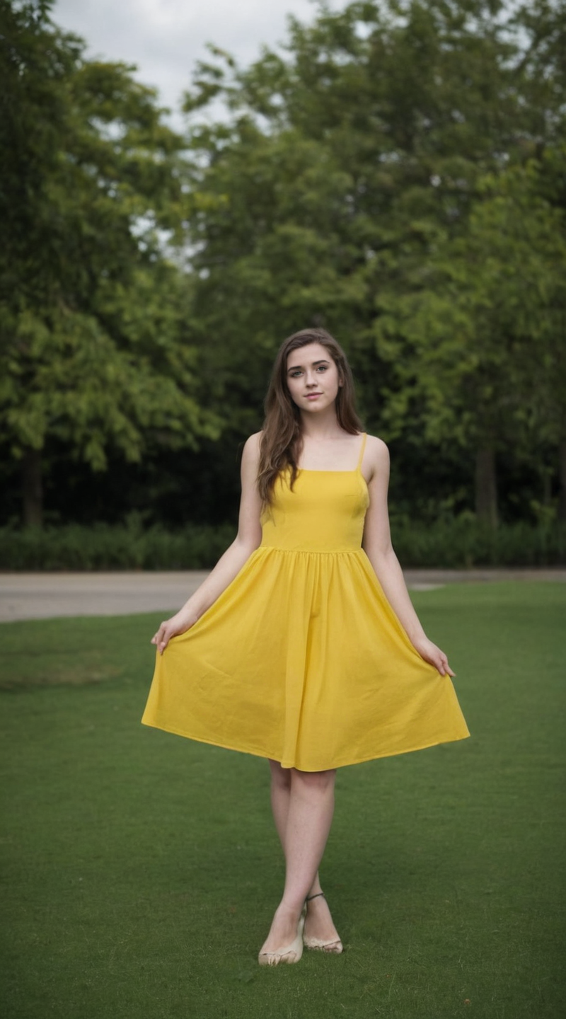 An unposed photo of full body portrait of a stunningly beautiful young woman, wearing a yellow dress, aperture f/1.6, ISO 32, shutter speed of 1/1224s