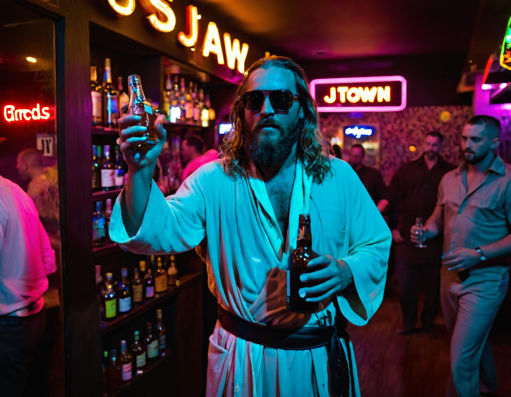 <lora:Check_Military:0.75> macro, detailed, realism, style, photograph, cinematic photo of jesus christ, drunk, intoxicated, wearing desert robe, with long straggly beard, long hair, wearing sunglasses, holding a bottle of whiskey, proprietor of a gay bar, standing in a strip club, , sleazy bar, in the vip area of strip club, ((a neon sign with text ("J-TOWN")<lora:texta:1>)) surrounded by male strippers, <lora:Perfect Hands:0.8> perfect, hands <lora:detailed:0.5> detailed style <lora:detailed_notrigger:1>