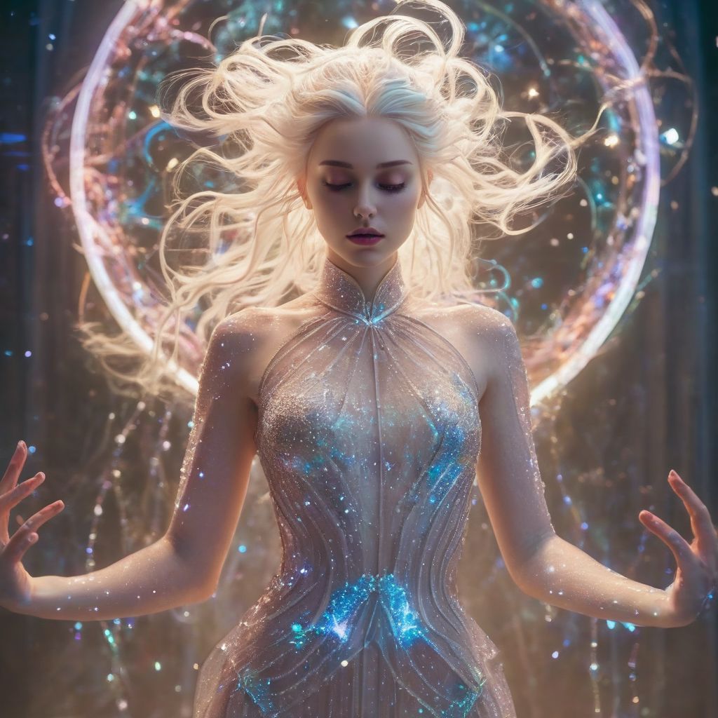 a cosmic fantasy queen with stars in her hair, pale white skin, thin athletic body in a dynamic sensual pose, wearing a sexy illuminated dress , translucent, bioluminescent, unusual colors, highly dramatic volumetric lighting