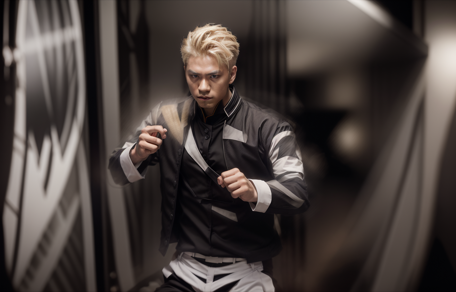 masterpiece photography, Japanese male student with blonde hair and wearing a black uniform, fighting pose , spiked hair, 4k quality , at the cinema <lora:add_detail:1>