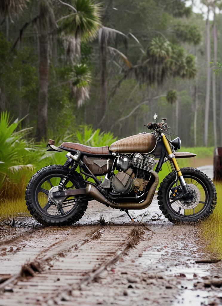 cinematic still of TWDDDBike on a dirt road in a dense swamp, hyperdetailed, rusty and weathered, shallow depth of field, alligator, in a hurricane <lora:TWDDDBike-000007:1>