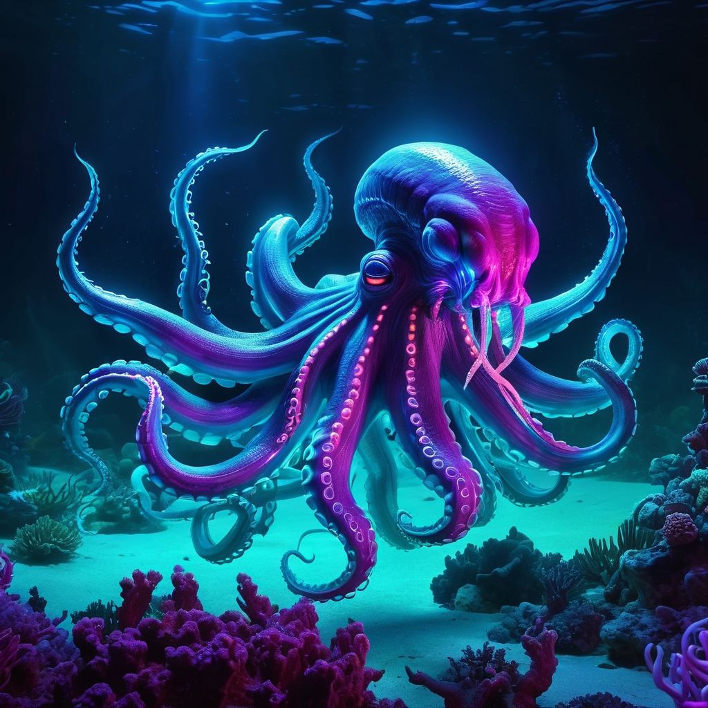 "Neon Kraken emerging from the deep sea, its tentacles illuminated by electric hues of synthwave light, creating a dramatic and surreal underwater scene with a retro-futuristic vibe."