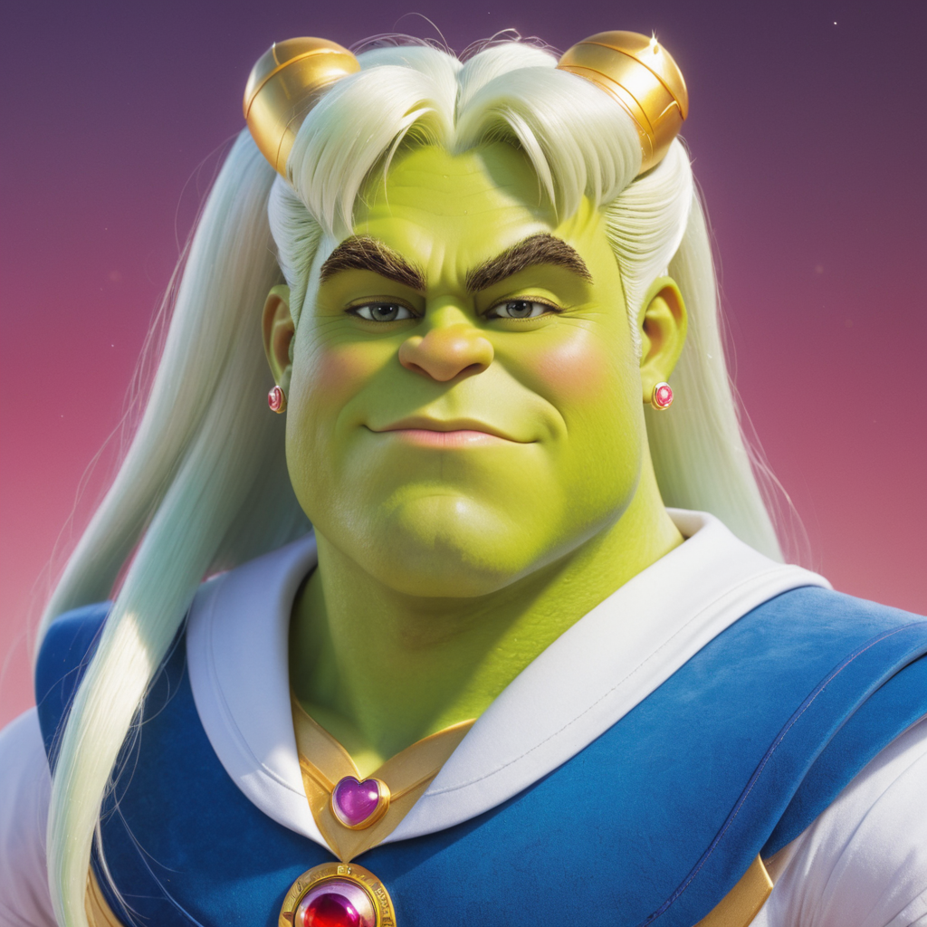 (caricature:1.1) of hybrid shrek sexy (sailor moon:1.3) with exaggerated features pale white skin, realistic textures, humor-infused, playful pixar style, masterpiece dof, best quality, every detail <lora:Contained_Color_SDXL:1> Contained Color