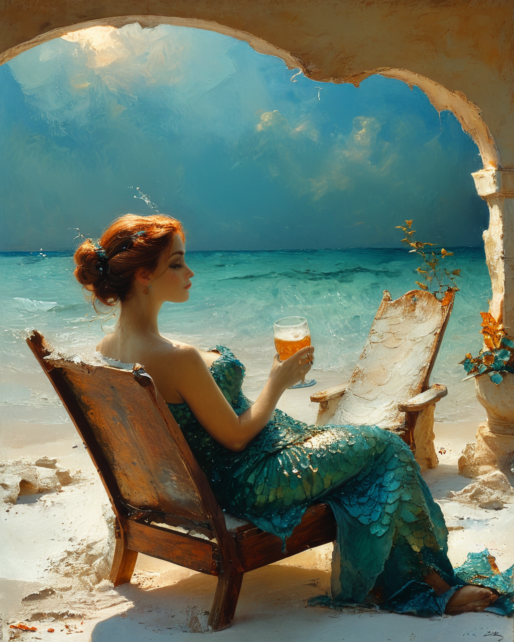 focus on a mermaid drinking beer in a lounge chair, blue water, white sand, chiaroscuro, frazetta, medium contrast, <lora:add-detail-xl:0.8>, <lora:Maxfield Parrish Style:1> Maxfield Parrish Style page