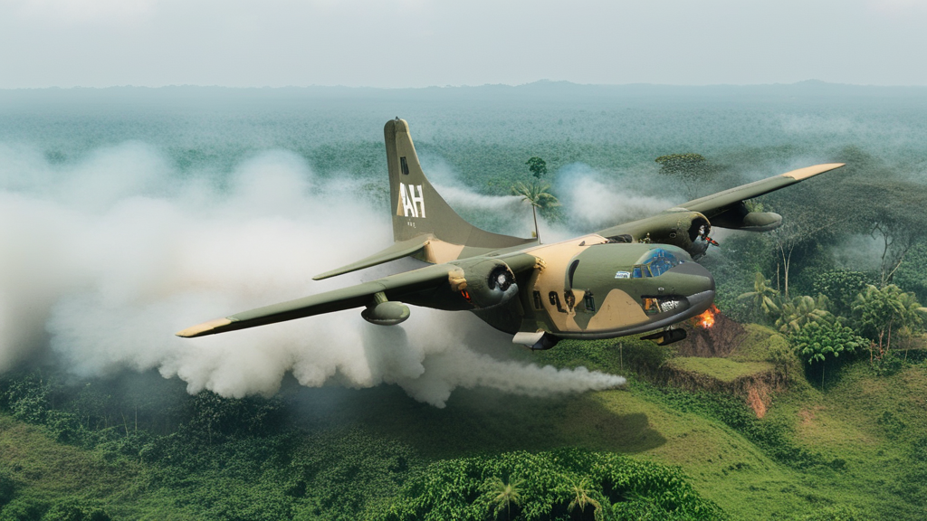 cinematic movie still of USAF (AIR_C123:2) flying over a village in a jungle, extremely detailed, viet nam, spraying white fog behind it, village on fire below, hyperdetailed, shallow depth of field, f1.4, <lora:AC_C123:1>
