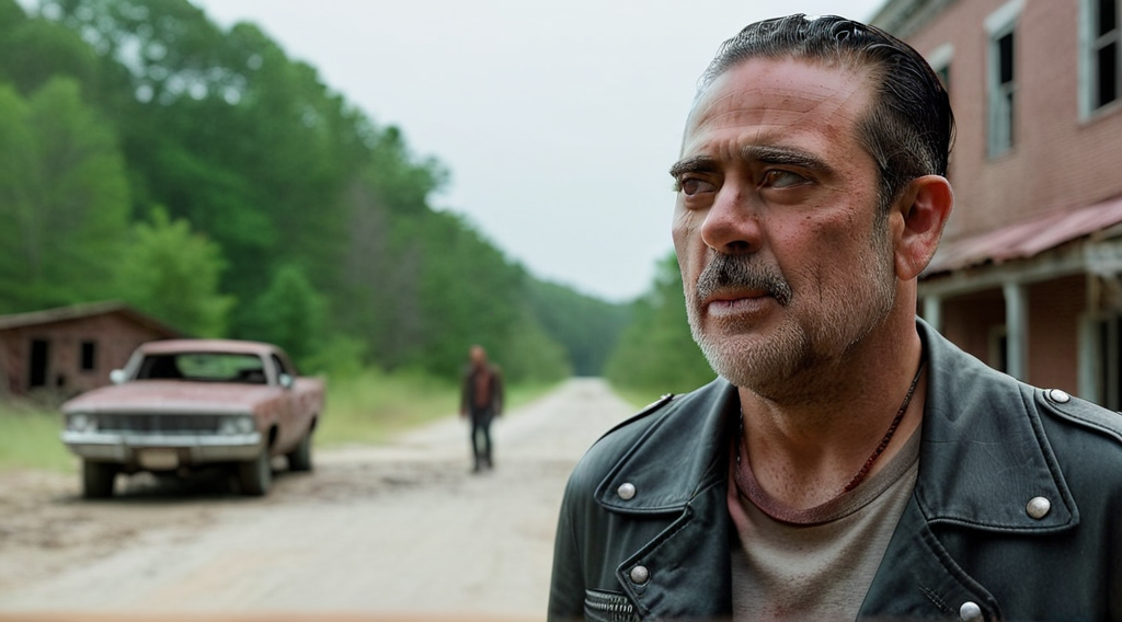 cinematic still of TWDNegan in an abandoned town, dirty street, abandoned cars, zombies, sharp eyes, looking into the distance, detailed face, lights out, hyperdetailed, shallow depth of field, f1.4, <lora:TWDNegan:1>
