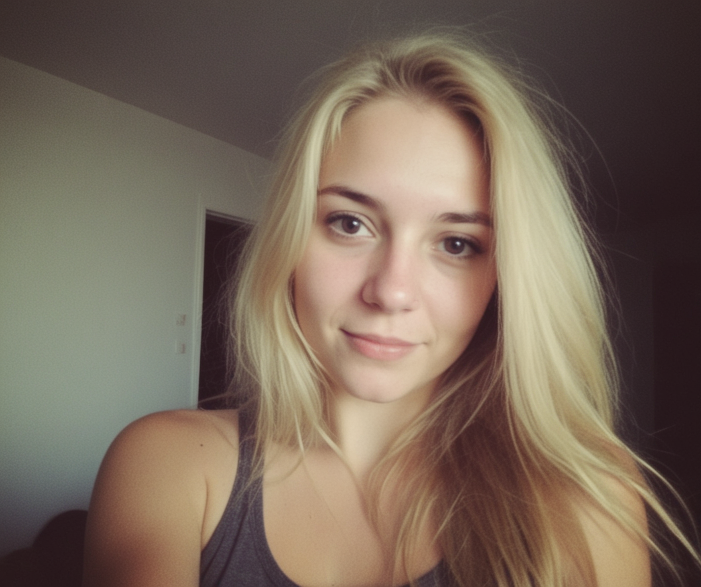(amateur webcam still), woman selfie, long blonde hair, bare shoulders, casual, photo screenshot, standard resolution, dim muted lighting, low quality, image, face, grainy, sleeveless top, fit