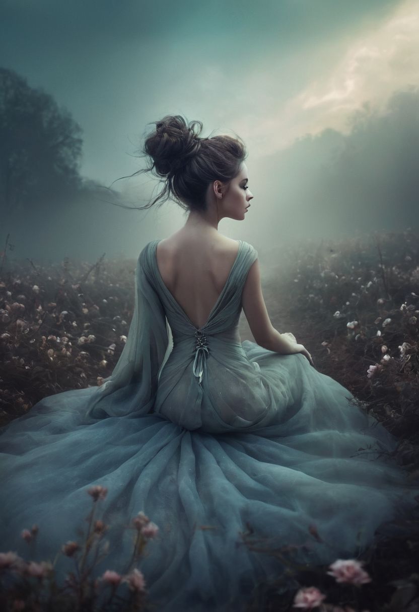 A wanderer from the celestial dimensions Soraka, Darkness graces every curve, Elegance in gloom. Divine proportion. Loish Anne Bachelier style, 32k, sitting on a field of flowers, looking up, ethereal form, voluptuous, messy bun hair, french kace flowing deep V dress, Fantasy Dream Art, reminiscent of a blend between deco steampunk and futuristic aesthetics, mist silhouette, top view, light, mist, moody, petal vortices, windy, mysterious, glossy hair, earthy, vivid, Abstract Neoralism