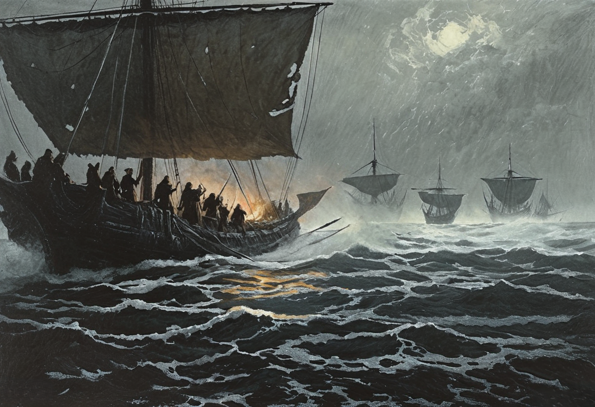 (masterpiece), (best quality), (ultra detail), Charcoal and chalk drawings. Exquisitely detailed, dark fantasy illustration depicts a surreal fantasy that captures the intense and dramatic landing of a Viking war party on the shores of England. Ships with intricately carved dragon heads cut through the fog, cutting the waves with oars. Vikings dressed in rough leather and iron armor jump from their ships, their fierce faces illuminated by the overcast sky, illustration, wild hair, detailed eyes, perfect composition, dewy skin, intricate details, earrings, cotton. This picturesque scene exudes calm and tranquility, evoking a feeling of unity with nature and a sense of the grandeur of the surrounding world. She invites the viewer to immerse herself in the contemplation of beauty and think about the eternal truths of existence, in the style of Bernie Wrightson, Anders Zorn, Alexi Brilo, Luis Royo