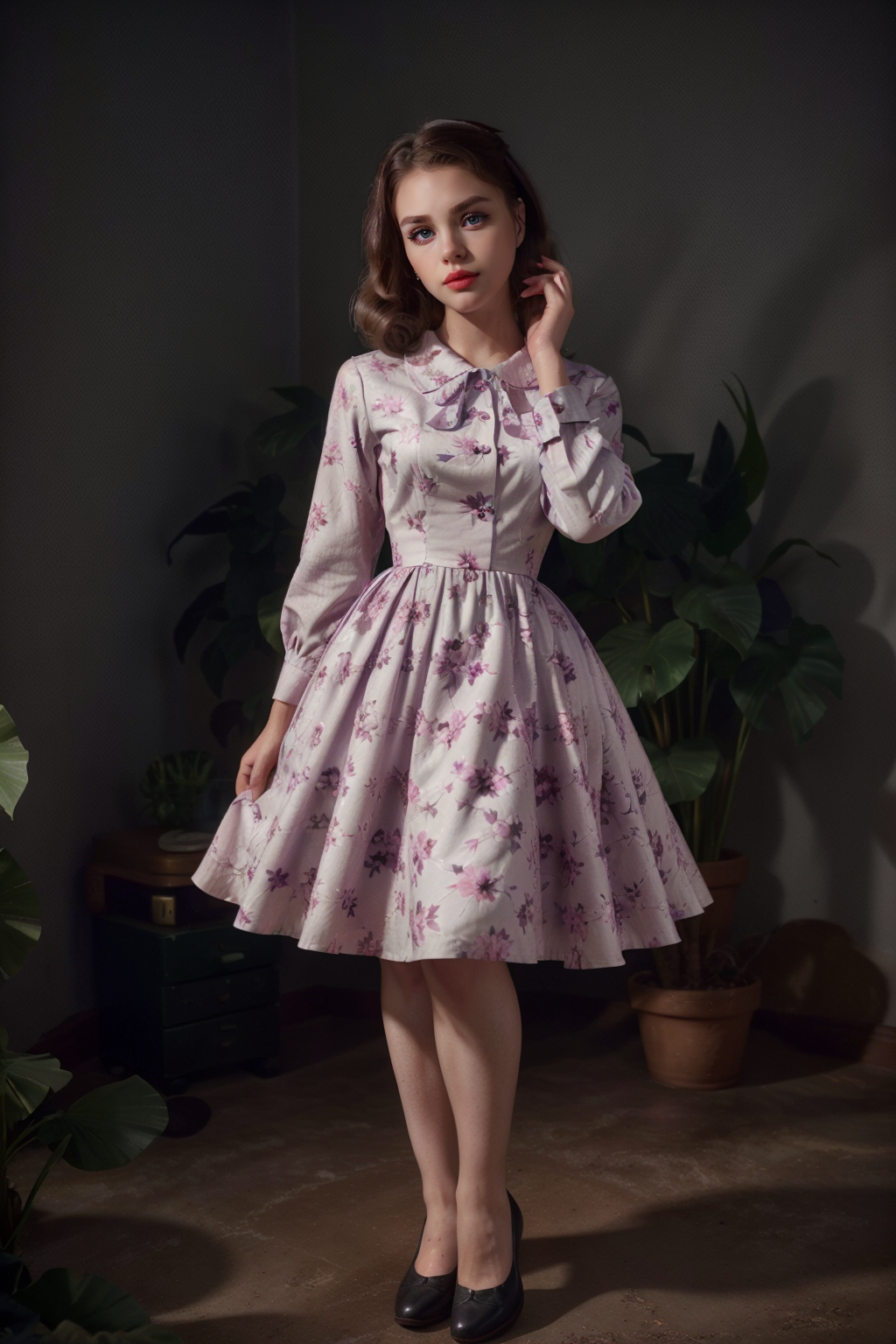 1950s Fashion, 1950sfloraldress, professional photo of 30yo female in Purple floral print dress, clothing details, (shoes), (posing), ((dark brown)) hair, 4k, 8k, high quality, perfect lighting, detailed face and detailed eyes, skin detail, solo focus, photography raw, ((wetland)), perfect lighting, clean smooth skin, looking at camera, detailed eyes, pretty face, full body standing posing, hands, (Renee Olstead,Julia Butters,Mary-Kate Olsen as 30yo female:0.8), <lora:1950sfloraldress-000002:0.5>, 1950s