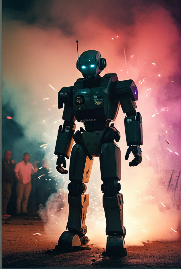 Color night news photo (giant tall sleek athletic military police humanoid bipedal riot enforcer robot arrests handcuffs human man protesting)(fire, posters, fireworks, color smoke)(evocative depth of field)(absolute sharpness) <lora:LCM-LoRA-XL_V1:0.21> <lora:SDXLHighDetail_v5:0.3> <lora:MJ52:.6> <lora:JuggerCineXL2:.6>