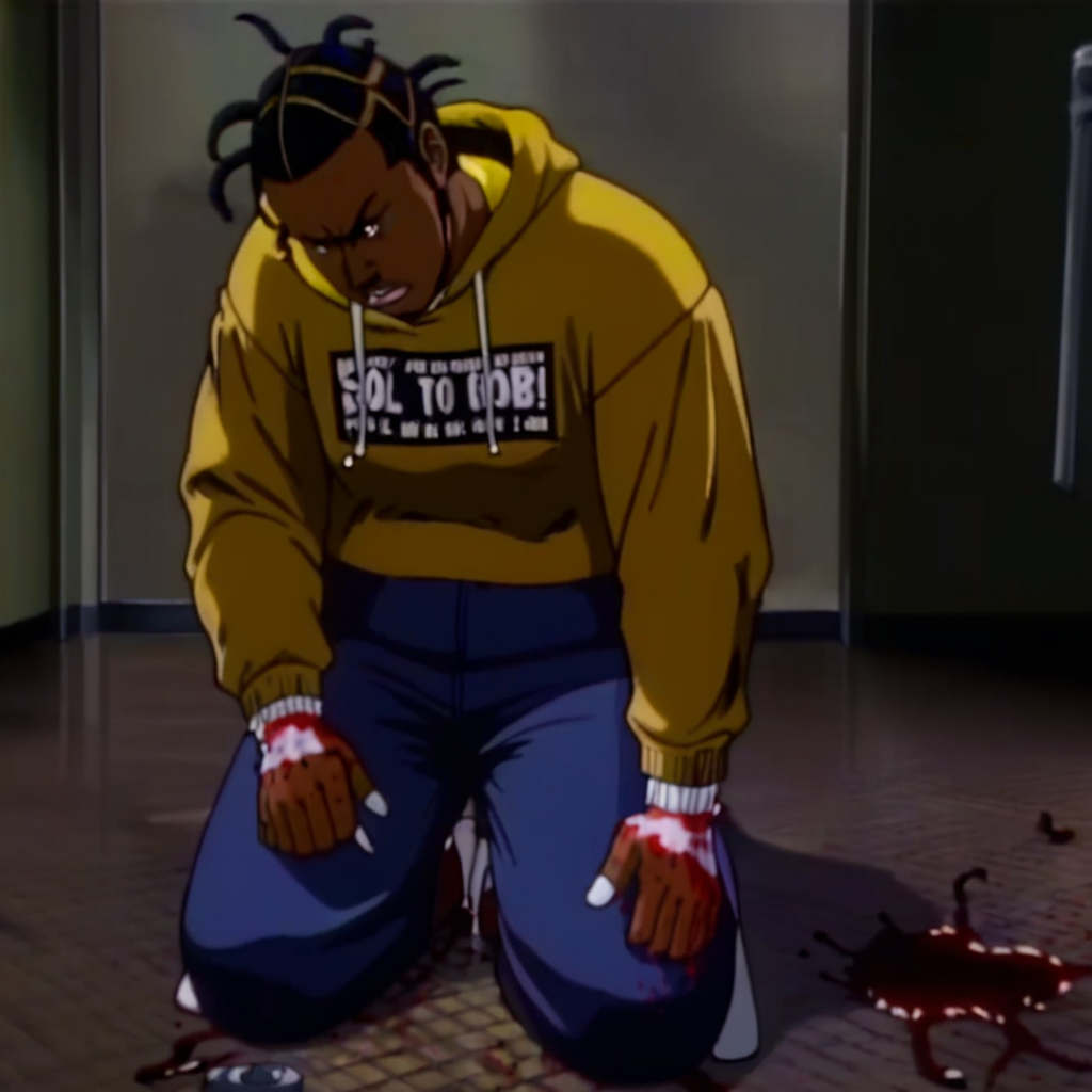 <lora:anglcp_angelcopXL:0.8> anglcp anime style, 1980s anime, anglcp style solo, black skin, full beard, yellow hoodie, blue pants, white shoes, white socks, blood everywhere, half of head blown off, brain particles on the floor, depth of field <lora:mkybrxl:0.8> mkybr, male focus, 1boy, dark-skinned male, small braids sticking out on head, photo background fat black man