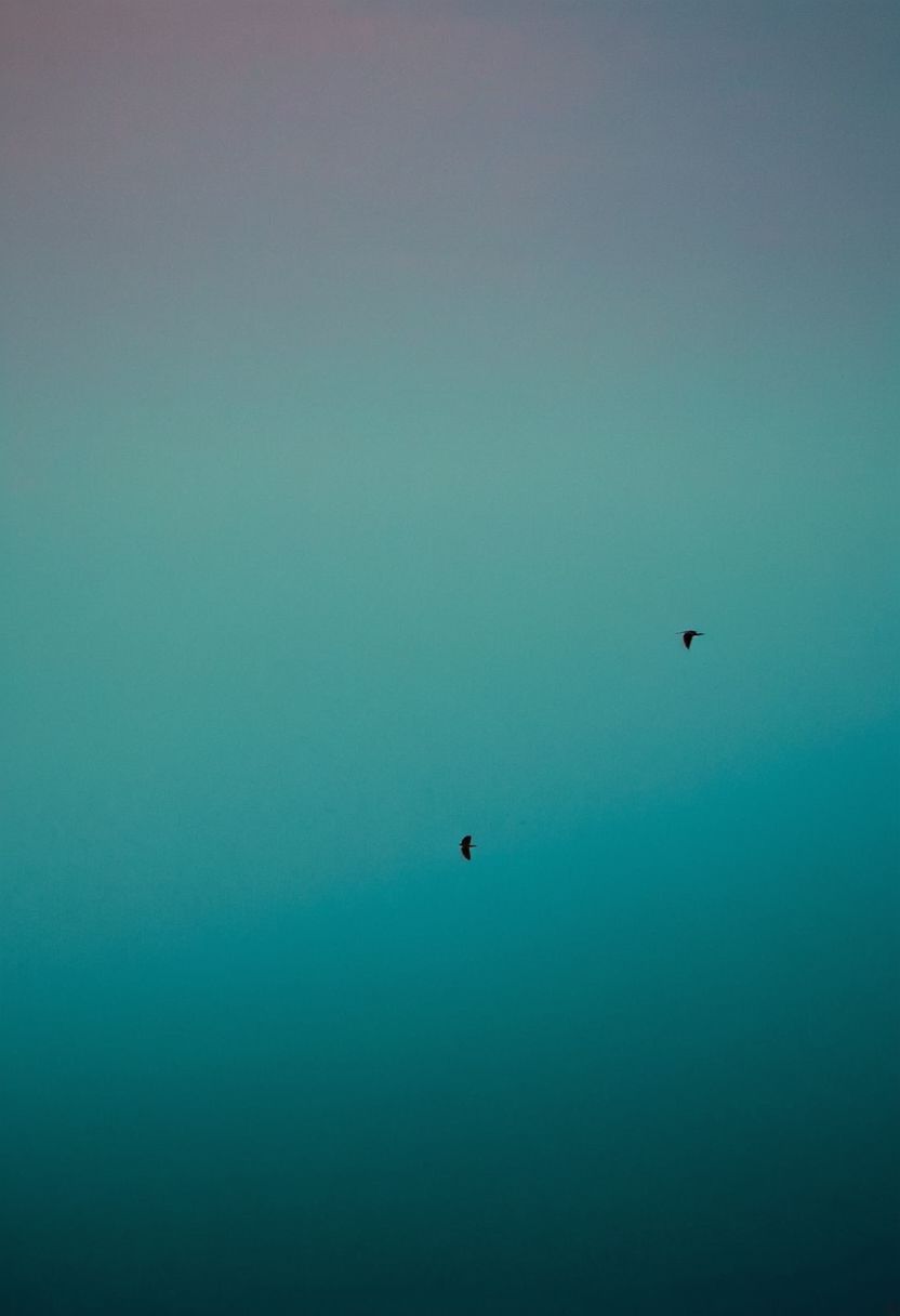 In this serene and surreal scene, the subject takes center stage, their features captured in stunning detail against a backdrop of teal-colored hues. Their natural skin tone radiates warmth and tranquility, contrasting beautifully with the cool multicolor tones of the environment. The focus is tight, drawing the viewer's attention to the subject's silhouette in profile, creating a sense of intimacy and depth. Above, small birds dance gracefully against the darkened sky, their movements adding to the surreal calm of the scene. This juxtaposition serves as a powerful visual metaphor, symbolizing the delicate balance between the ethereal and the earthly realms.