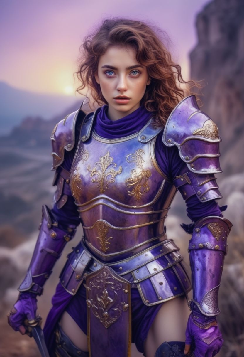amidst shades of purple, with only a touch of yellow, Louis Royo's works, watercolor painting, style of Jovana Rikalo, woman in armor, HXARMOUR, fighting pose, in background a fantasy landscape, very detailled background, intricated details,triadic colors, luminism, vibrant colors, complex background, High detail,highly detailed beautiful expressive eyes, detailed eyes, 35mm photograph, film, bokeh, professional, 4k, highly detailed dynamic lighting, photorealistic, 8k, raw, rich, intricate details, identical iris, curly auburn hair