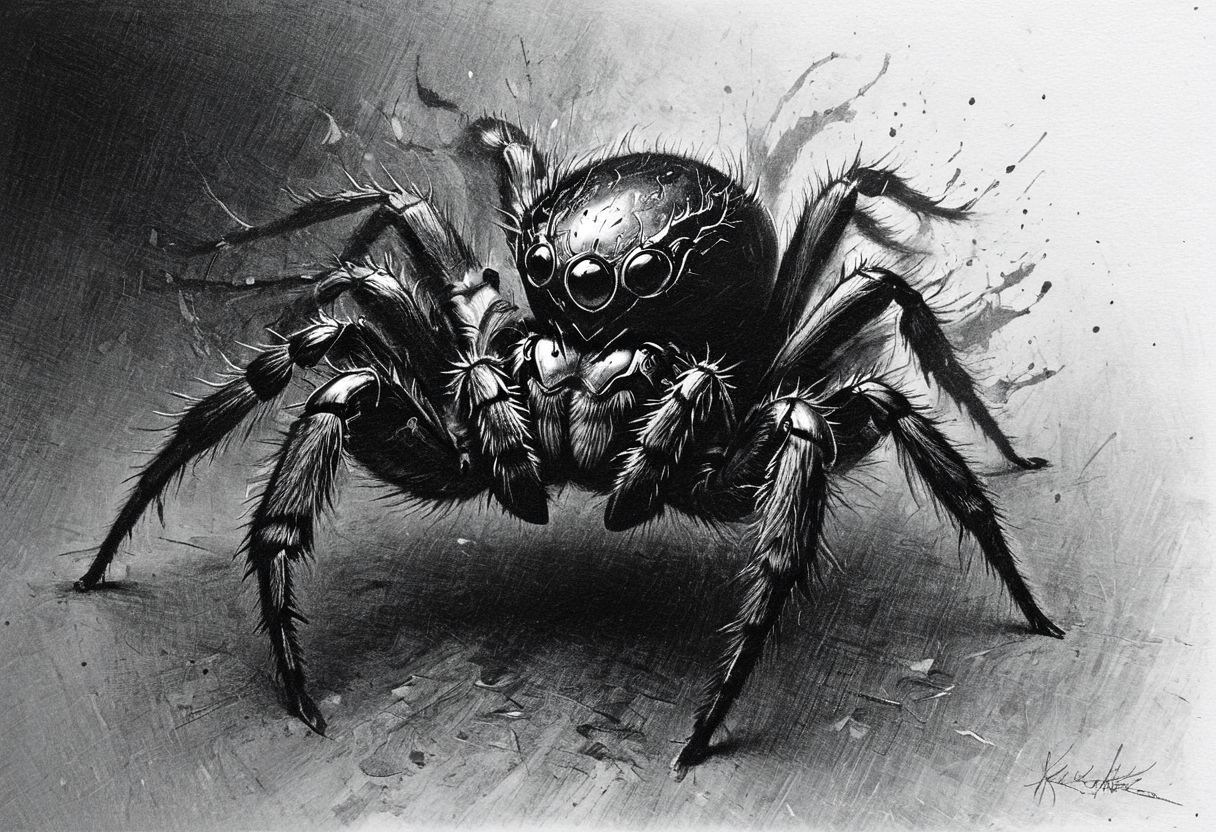 Charcoal drawing, black pencil drawing, pencil drawing, line drawing, black and white drawing, graphite drawing, white background game style streetfighter, catspider, sci-fi ring, refraction, dynamism, high detail, artstation, concept art, smooth, sharp focus, illustration, art by Karn Griffiths and Vadim Kashin, graffiti airbrush technique, high resolution, accent lighting, contrast with bright colors of paint,