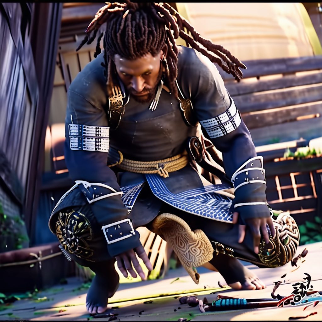 , <lora:acstyl_shadowcreedXL:0.9> acstyl style, hyper realistic video game <lora:riiahworldxl:0.8> rhwrld, dreads in a bun, black man, wearing samurai armor, stansing on a teshu building