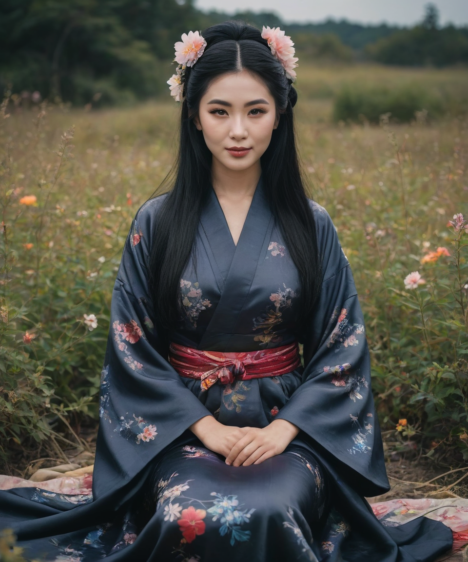 professional portrait,Dark art,chdmchlwrd,a yokai japanese woman is sitting down,kimono robe,long silky black hair,evil smile,flower field,professional,ultrahigh quality,hyperdetailed photography,masterpiece,colorful details,detailed skin,4k textures,8k resolution,<lora:chdmchlwrd:1.1>,