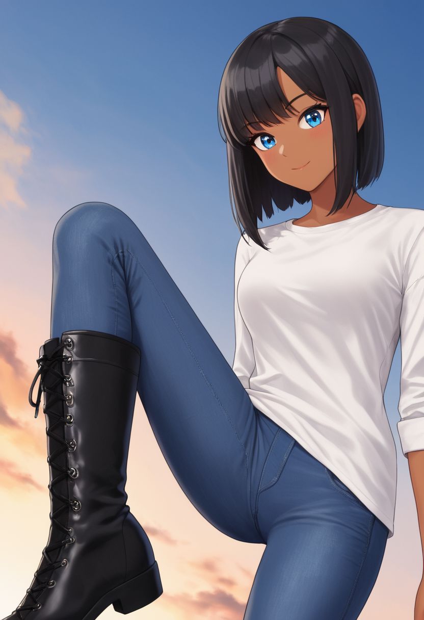 Woman, sky blue eyes, long black hair, slightly tanned, slender figure, blue jeans, white shirt, black boots