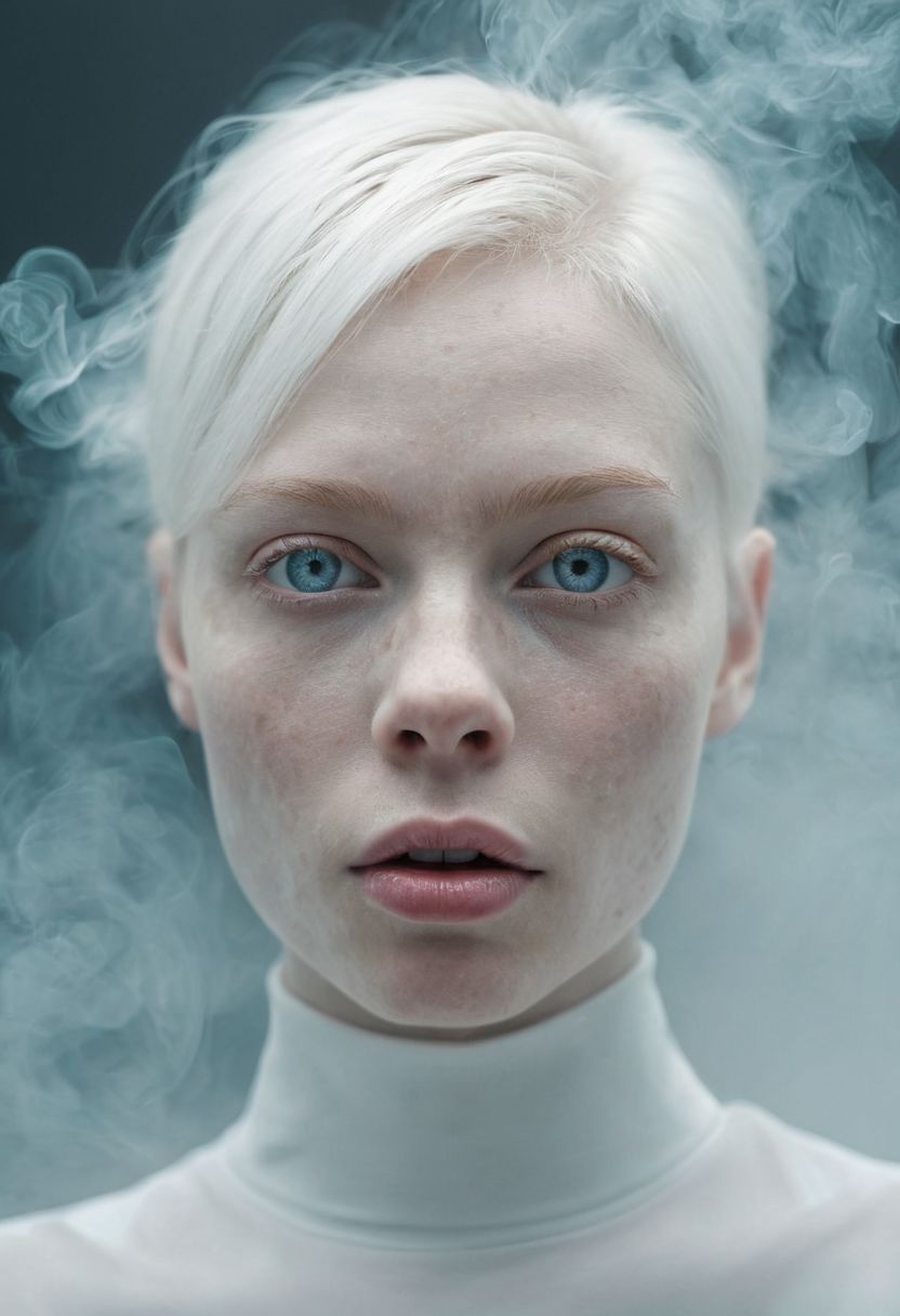 atmosphere, mysterious glow, aesthetic of postcolonial art and impressionism:0.1), artistic magnum opus with polished details, (moonstone white and teal colors:0.1), <lora:MJ52:0.3> <lora:xl_more_art-full_v1:0.3><lora:MJ52:0.5>>contemplative, smirk, piercing blue eyes, extremely long hair, sleek hair, portrait, dynamic pose, (blue turtleneck), 100mm f/2.8 macro lens, , full body, battle stancevibrant, (Cinematic Photography by David Bailey and Adeline Boutain:1.2), award-winning photography, aesthetic and beauty, impeccable details, uniform focus, f/1.4, breakthrough, multiple exposure photography, (center composition, symmetry composition:0.1), (smoke gray and multi-color colors:0.1) <lora:MJ52:0.8> <lora:- SDXL - vanta-black_contrast_V3.0:0.5>black Show less ethereal, (albino:1.3) (nymph:1.3), (albinism:1.4), Lengthened Rectangular Face with Noticeable Jaw and Cheekbones, Clean, Straight Eyebrows, Wide-Set Close-Set Eyes, Majestic Aquiline Nose, Full Lips, windswept (Fine) (stylish short white hair:1.3), (looking at viewer),(Ashen skin:1.3), (flawless skin:1.3), (shiny skin), diaphanous white dress, high neckline on dress, (foggy:1.2), (bathed in thick fog:1.4), (half-obscured:1.1), (Close up:1.2), Dutch Angle), (dynamic composition:1.2), (shallow depth of field:1.2), bright lighting vibrant, in the style of (Ansel Adams:1.3) (Rule of thirds:1.1) Show less