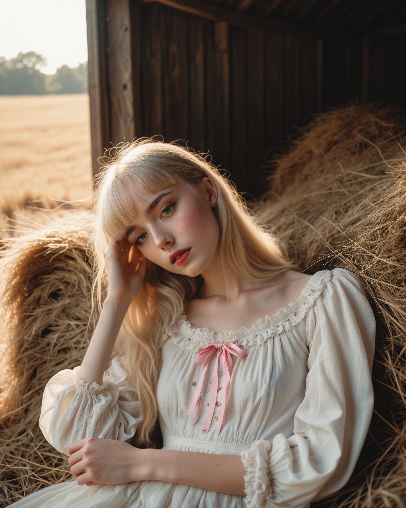colonial era barn, 21-yo woman, long bleached-blonde hair, sleeping in the hay, dried flowers, blushing pink cheeks, bright pink lips, blunt bangs, long eyelashes, black mascara, volumetric lighting, sun haze, golden hour, long legs, provocative colonial mini-dress, puffy sleeves, bows, frilly socks, detailed face, detailed hands, soft focus, film grain, medium format, 120mm hasselblad <lora:MJ52:.3>