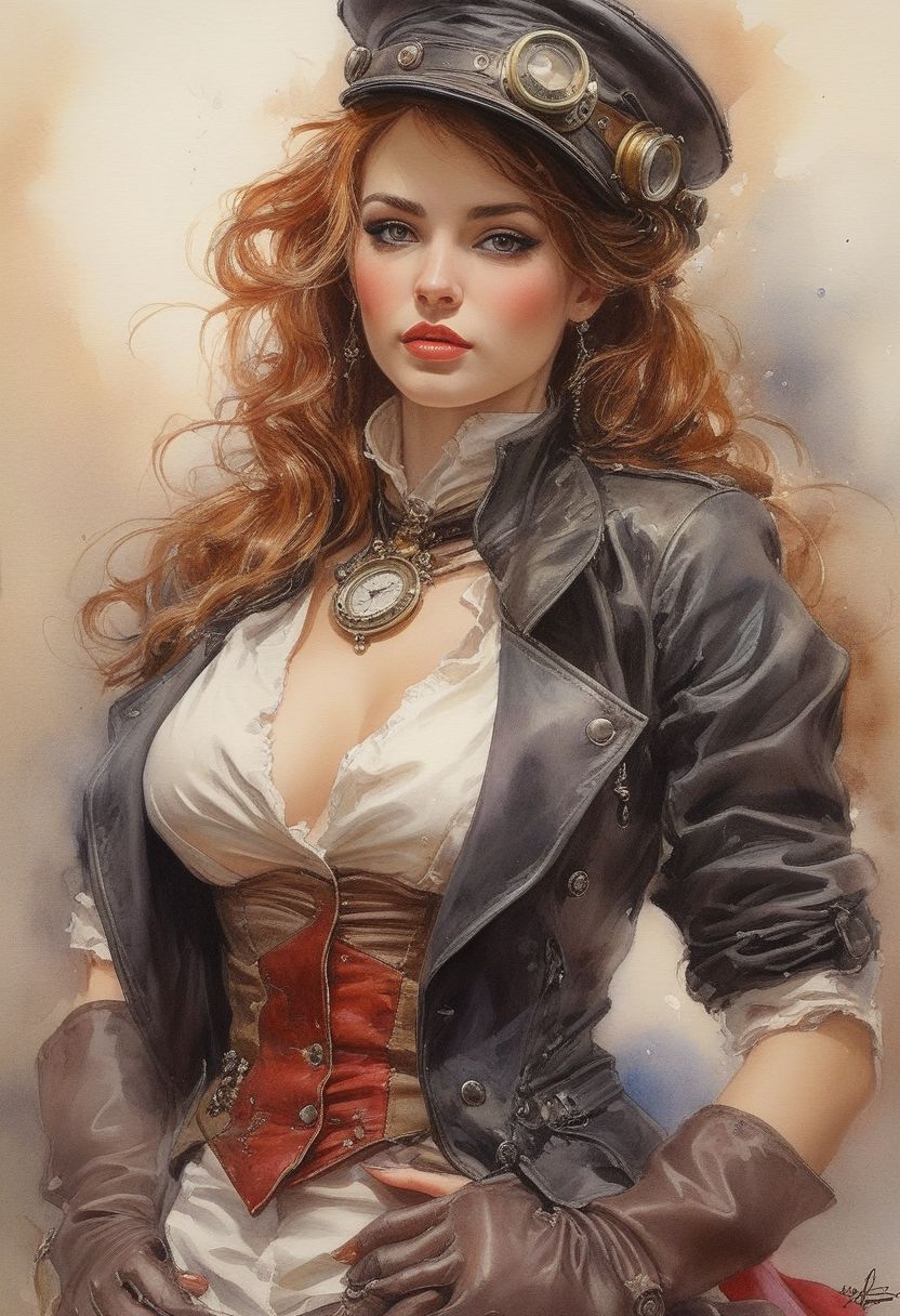 Louis Royo's works, watercolor painting, wlop style, steampunk pop-art sexy pin-up art-nouveau, s low viewing angle,very detailled, deep shadow, triadic color,vibrant colors, hyperdetailled picture, brush work, masterpiece, contrast work