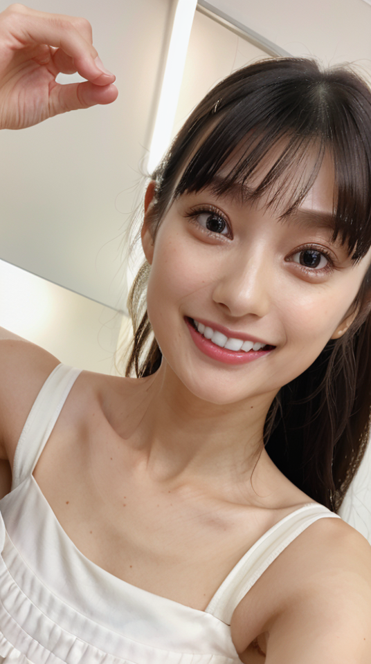 1girl, japanese, cute, highly detailed face, long-shaped and narrowed eyes:1.2, small pupil, 30 years old, light smile, teeth, dynamic pose, <lora:kounomarika_lora-06:0.9>, best quality, white dress, selfie, smartphone,