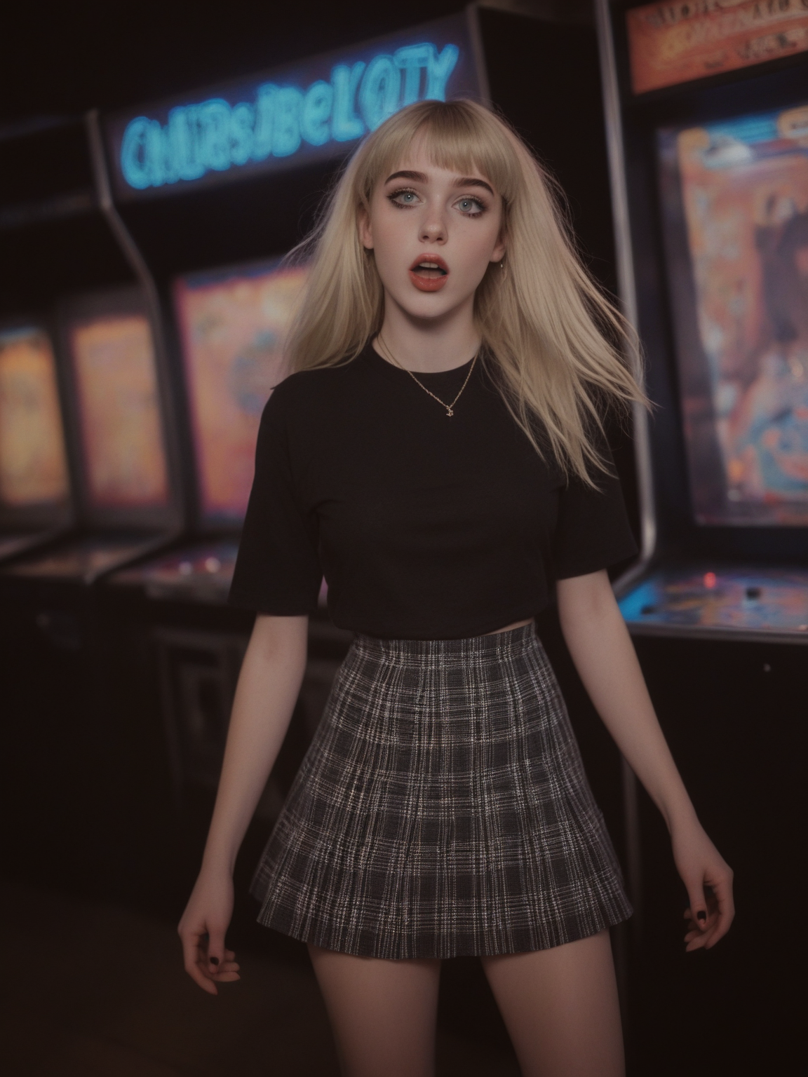 beach boardwalk arcade, pinball machine, neon light, dimly lit, 21yo blonde, small breasts, blunt bangs, narrow hips, skinny, thin, cute pleated skirt, tight cute t-shirt, perfecteyes, glossy black lipstick, pale freckled skin, blushing pink cheeks, long eyelashes, long legs, thigh highs, thigh gap, platform high heels, very long hair, bold dark goth makeup, subtle details, unique perspective, playing game, photograph, detailed, realistic, detailed teeth, detailed hands, whole body, soft lighting, soft focus, lush lips, tooth gap, goosebumps, 1990's style <lora:PerfectEyesXL:.6> <lora:1990's style:.85> <lora:add-detail-xl:2>