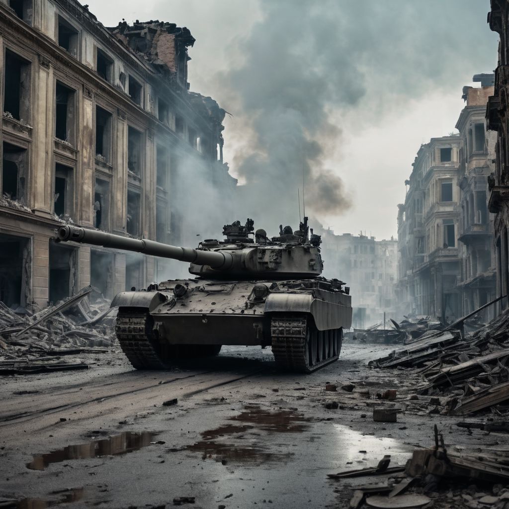 A war tank moving through a destroyed city, ultra detailed, smoky environment, cloudy day, desolation, destroyed buildings, epic, masterpiece, cinematic lighting, intrincate details, best quality, 8k