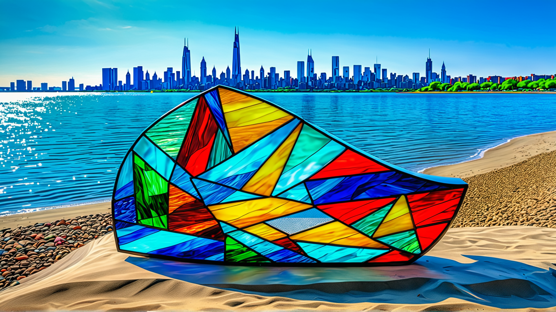A modern colorful sculpture made of stained glass,on a lakeside beach,a city skyline in the distance,Nikon Photography,8K,HDR,National Geographic,Aerial Photography,