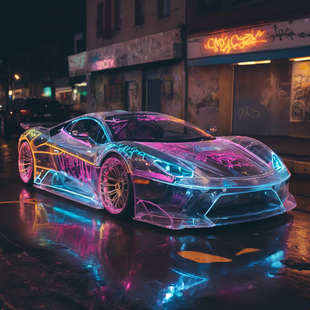 cinematic still,super car,(transparent body:1.3),engraved graffiti,neon lights,street,night,colorful