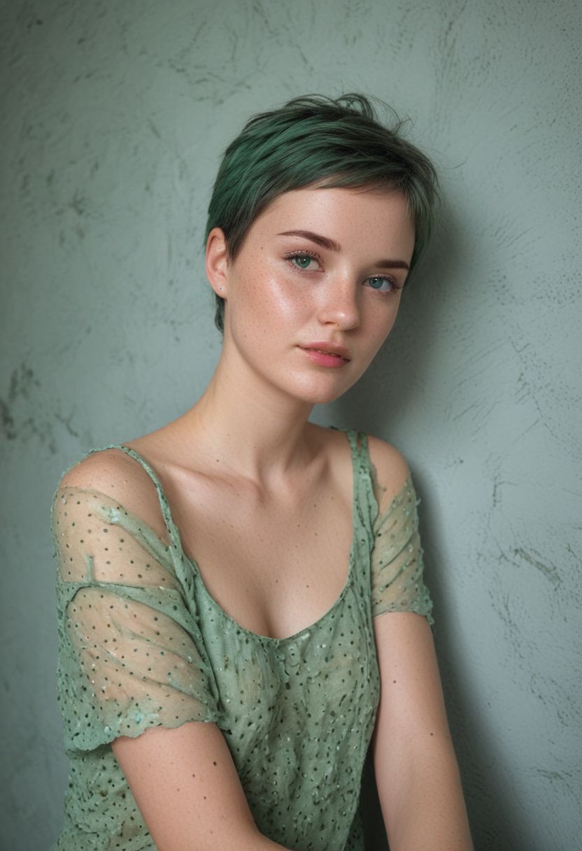 beautiful light white lady, (freckles), , blue hazel eyes, Short hair, green color hair, dark makeup, hyperdetailed photography, soft light acne on her face, full body lay on wall posing
