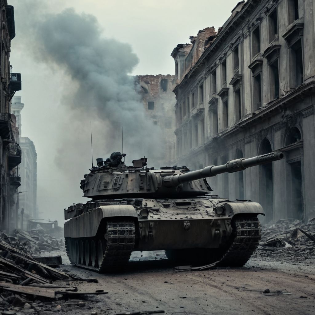A war tank moving through a destroyed city, ultra detailed, smoky environment, cloudy day, desolation, destroyed buildings, epic, masterpiece, cinematic lighting, intrincate details, best quality, 8k