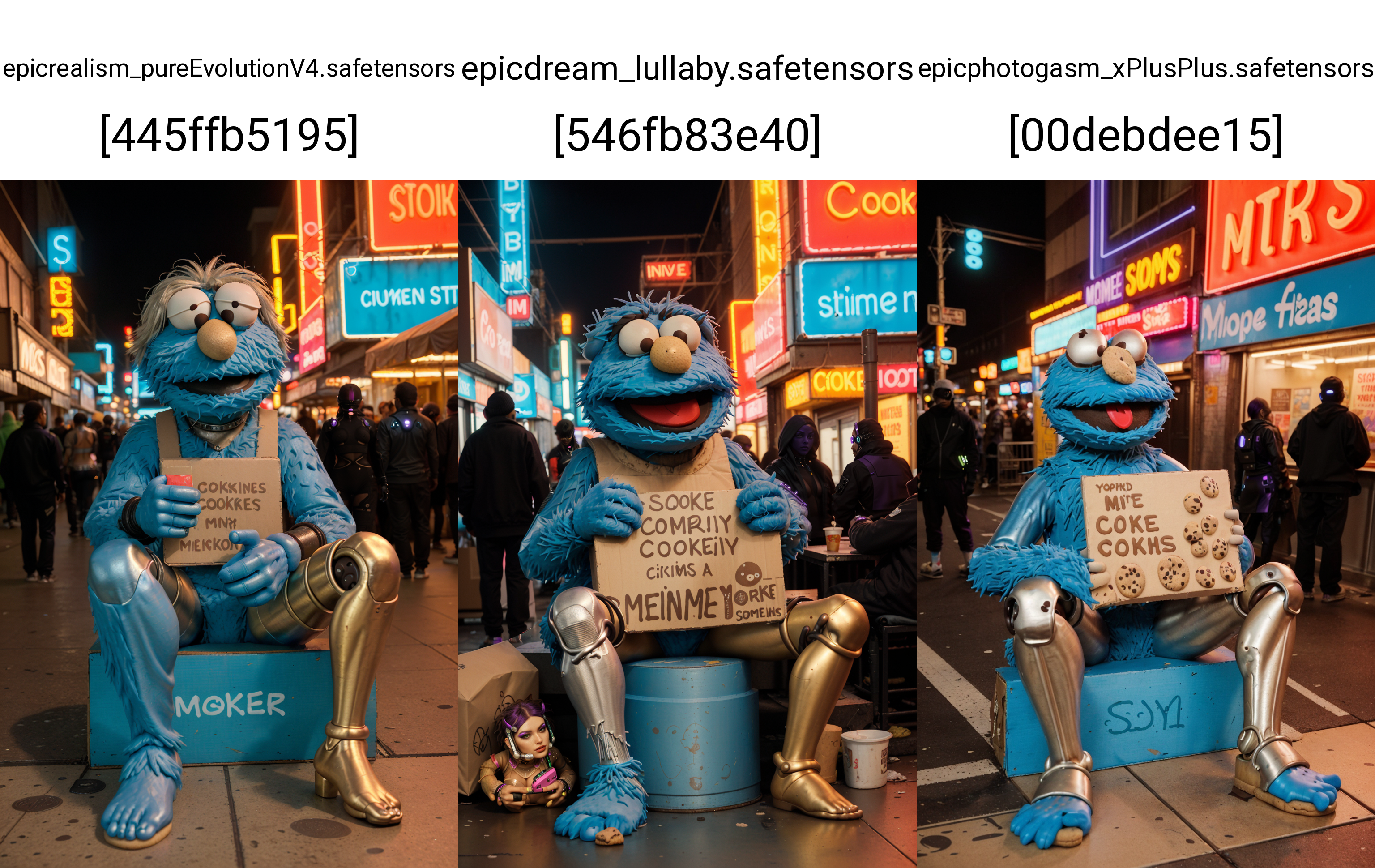 homeless poor man sitting on Sesame Street, man begs for alms, (Cookie Monster), holding cardboard with (cookies), (prosthetic metallic legs), crowd in background, night city, neon lights, cyberpunk