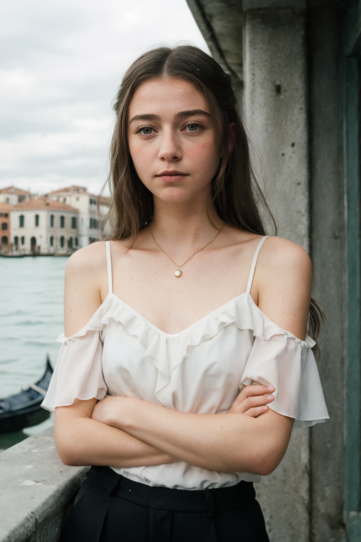 (closeup) Portrait of pretty young (18-year-old) Caucasian (futuraalyssa4500v5) ((Confident power pose with crossed arms.:1.07)), (flat chest:1.15), outdoor, BREAK (white hair Glamorous side-swept curls: Cascading curls swept to one side, creating a glamorous and romantic look that oozes elegance.), no makeup, long dainty necklace, (((sfw, elegant, classy) Pale pink chiffon blouse with a ruffled neckline and wide-leg trousers.)) , <lora:epi_noiseoffset2:1> BREAK (magazine cover:1.10), BREAK (masterpiece, extremely detailed skin, photorealistic, heavy shadow, dramatic and cinematic lighting, key light, fill light), sharp focus, BREAK location is (outdoor Venice, Italy:1.2), <lora:InstantPhotoX3:0.35>