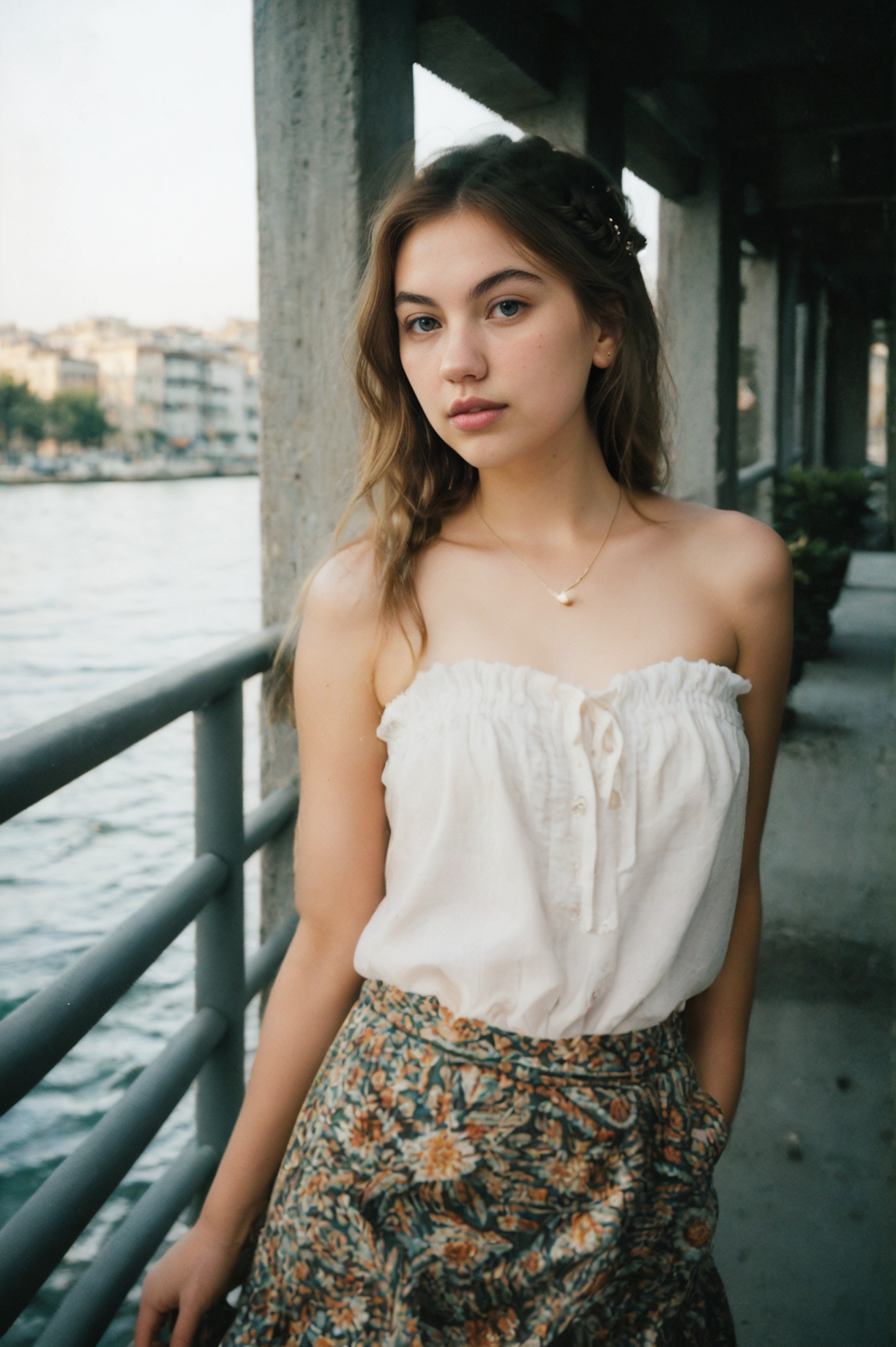 futuraholly10000v5 ,(closeup) Portrait of pretty young (18-year-old) pale milky white skin Caucasian woman ((Lean against a railing, one foot propped up, exuding grace.:1.07)), (flat chest:1.15), outdoor, BREAK (blonde Boho Braids: Loose and bohemian-inspired braids, adorned with delicate flowers or accessories for a free-spirited look.), no makeup, long dainty necklace, ((classy Black strapless dress with sweetheart neckline and feathered skirt - bold and glamorous.)) , <lora:epi_noiseoffset2:1> BREAK (magazine cover:1.10), BREAK (masterpiece, extremely detailed skin, photorealistic, heavy shadow, dramatic and cinematic lighting, key light, fill light), sharp focus, BREAK location is (outdoor Istanbul, Turkey), <lora:InstantPhotoX3:0.7>, <lora:ClothingAdjuster3:-0.7>