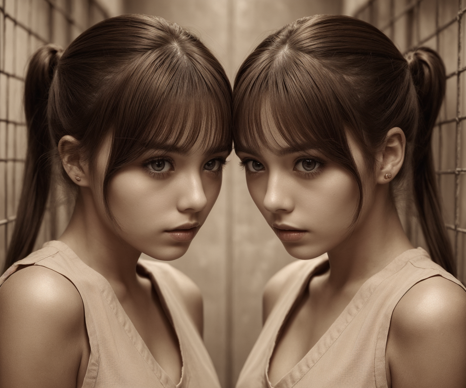a good-looking cute young girl with short twin tail Sepia Brown hair, perfect body, beautiful detailed face, prison, romantic mood, (dynamic angle:1.15), <lora:Mild detail adjusterV10:0.7>