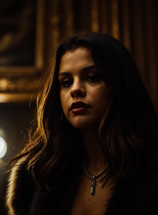 SelenaGom3z<lora:SelenaGom3z2-v15-byShurik:1> (looking at viewer) (close up) LikenessHelpbyShurik3 Woman In this striking close-up shot, we are introduced to a figure of undeniable power and menace, a drug lord exuding an aura of sophistication and danger. (Best quality: 1.3) Seated on a majestic throne, her commanding presence dominates the frame, leaving no doubt about her authority. (Masterpiece: 1.3) Clad in a lavish fur coat, he emanates an air of opulence and extravagance, a symbol of her wealth and influence. The fur's texture and rich color amplify her imposing presence, creating a visual contrast against the darkness that envelops him. (Detailed fur coat: 1.2) Moody and dramatic lighting casts eerie shadows across her face, adding an air of mystery and intrigue to her countenance. A single light source illuminates her features, emphasizing her sharp, piercing eyes that seem to hold the weight of untold secrets and ruthlessness. (Moody dramatic lighting: 1.4) The room is filled with swirling smoke, creating an atmosphere of haze and concealment, hinting at the illicit activities that transpire within its walls. The smoke intertwines with the darkness, heightening the sense of danger and unpredictability that surrounds this enigmatic figure. (Smoke-filled room: 1.3) In this close-up portrayal, we catch a glimpse of the drug lord's calculated charisma and sinister charm. The intricate play of light and shadow accentuates the duality of her character, reminding us of the inherent darkness that lurks beneath her sophisticated facade. (Close-up expression: 1.3)