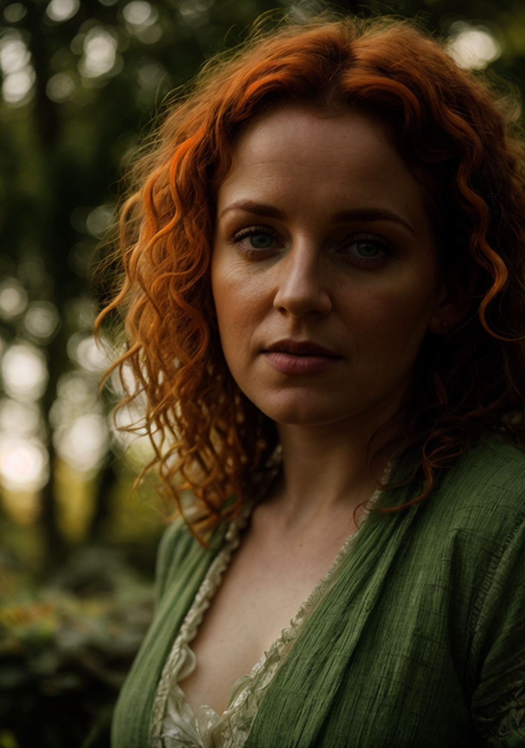 photo portrait of a Irish woman, green and orange, curly hair, soft cinematic light, adobe lightroom, photolab, hdr, intricate, highly detailed, fine details, key light, backlight, sharp focus, soothing tones, low contrast, exposure blend, movie scene, film grain, bokeh, <lora:lowra_v10:0.2>