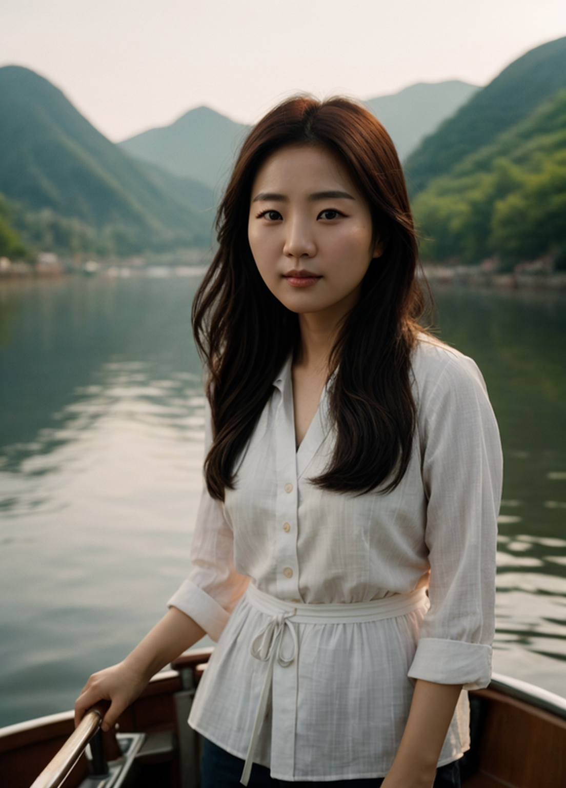 photo portrait of an korean woman standing on a boat, promotional material, advertisement, a soft cinematic light, adobe lightroom, photolab, hdr, intricate, highly detailed, fine details, key light, backlight, sharp focus, soothing tones, low contrast, exposure blend, movie scene, film grain, bokeh