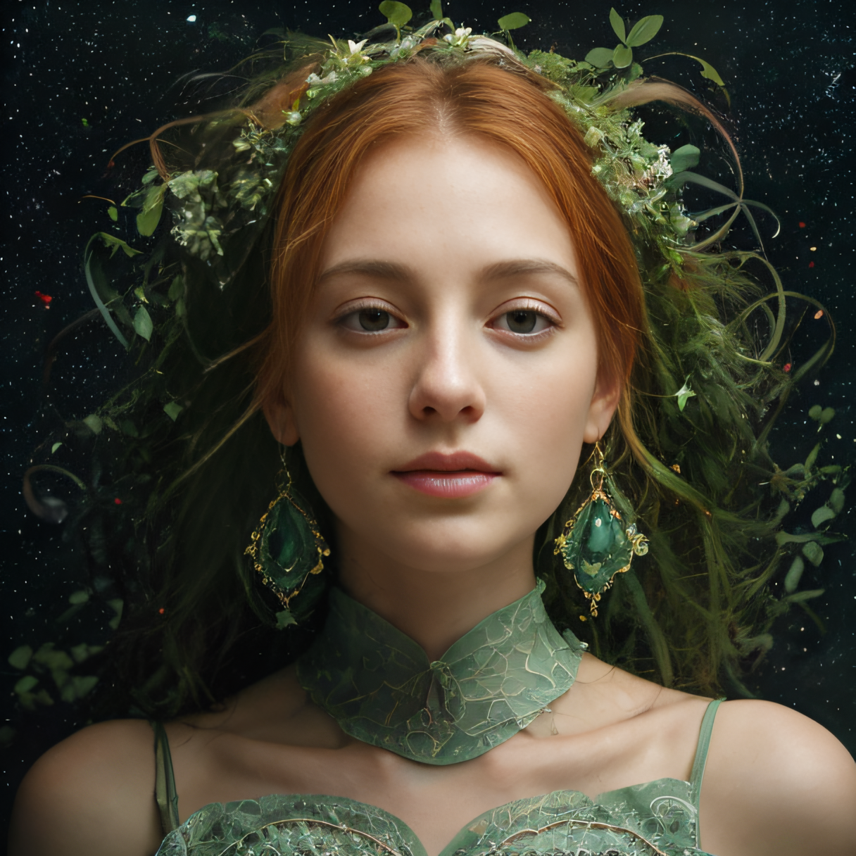 A mesmerizing portrait captures the essence of 30 year old human beauty through an enchantress's characteristic side-view - her lustrous red hair cascading down against freckled skin. (((wearing a green dress))), a shamrock in her hair, This ethereal figure exudes a divine blend of spirituality,kindness,and feminine grace that transcends reality itself; her big,green,eyes peer into our very souls with unparalleled tenderness. Her soft smile radiates warmth like sunshine while being framed within symmetrical perfection amidst volumetric lighting - casting shadows reminiscent of celestial bodies under starlit skies captured by astrophotographers. every detail meticulously photographed creating depth beyond imagination which is both breathtakingly intricate yet minimalist at its core. This stunning piece titled "Celestial Serenade" stands out among contemporary works as it showcases the epitome of artistic excellence inspired by Mumford & Simonetti's timeless aesthetics blended seamlessly together with Guy Denning's signature touch making each brushstroke sing its own symphony. It truly embodies all aspects defining true masterpieces from trending visual narratives found on ArtStation to jaw-dropping realism portrayed through rich hues imbued across every inch,filmgrain,