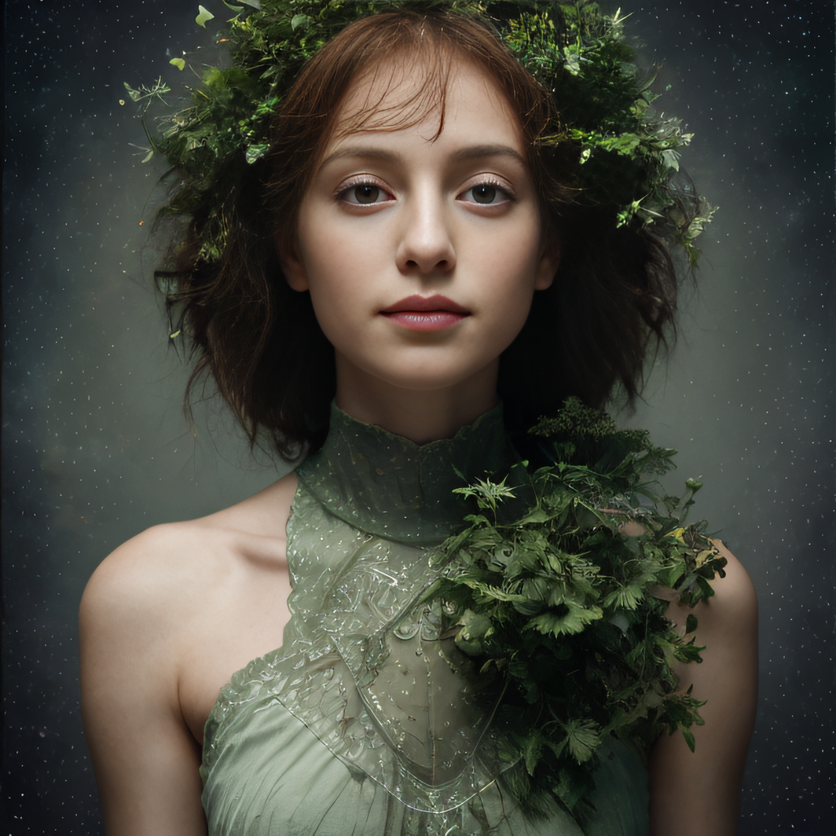A mesmerizing portrait captures the essence of 30 year old human beauty through an enchantress's characteristic side-view - her lustrous red hair cascading down against freckled skin. (((wearing a green dress))), a shamrock in her hair, This ethereal figure exudes a divine blend of spirituality,kindness,and feminine grace that transcends reality itself; her big,green,eyes peer into our very souls with unparalleled tenderness. Her soft smile radiates warmth like sunshine while being framed within symmetrical perfection amidst volumetric lighting - casting shadows reminiscent of celestial bodies under starlit skies captured by astrophotographers. every detail meticulously photographed creating depth beyond imagination which is both breathtakingly intricate yet minimalist at its core. This stunning piece titled "Celestial Serenade" stands out among contemporary works as it showcases the epitome of artistic excellence inspired by Mumford & Simonetti's timeless aesthetics blended seamlessly together with Guy Denning's signature touch making each brushstroke sing its own symphony. It truly embodies all aspects defining true masterpieces from trending visual narratives found on ArtStation to jaw-dropping realism portrayed through rich hues imbued across every inch,filmgrain,