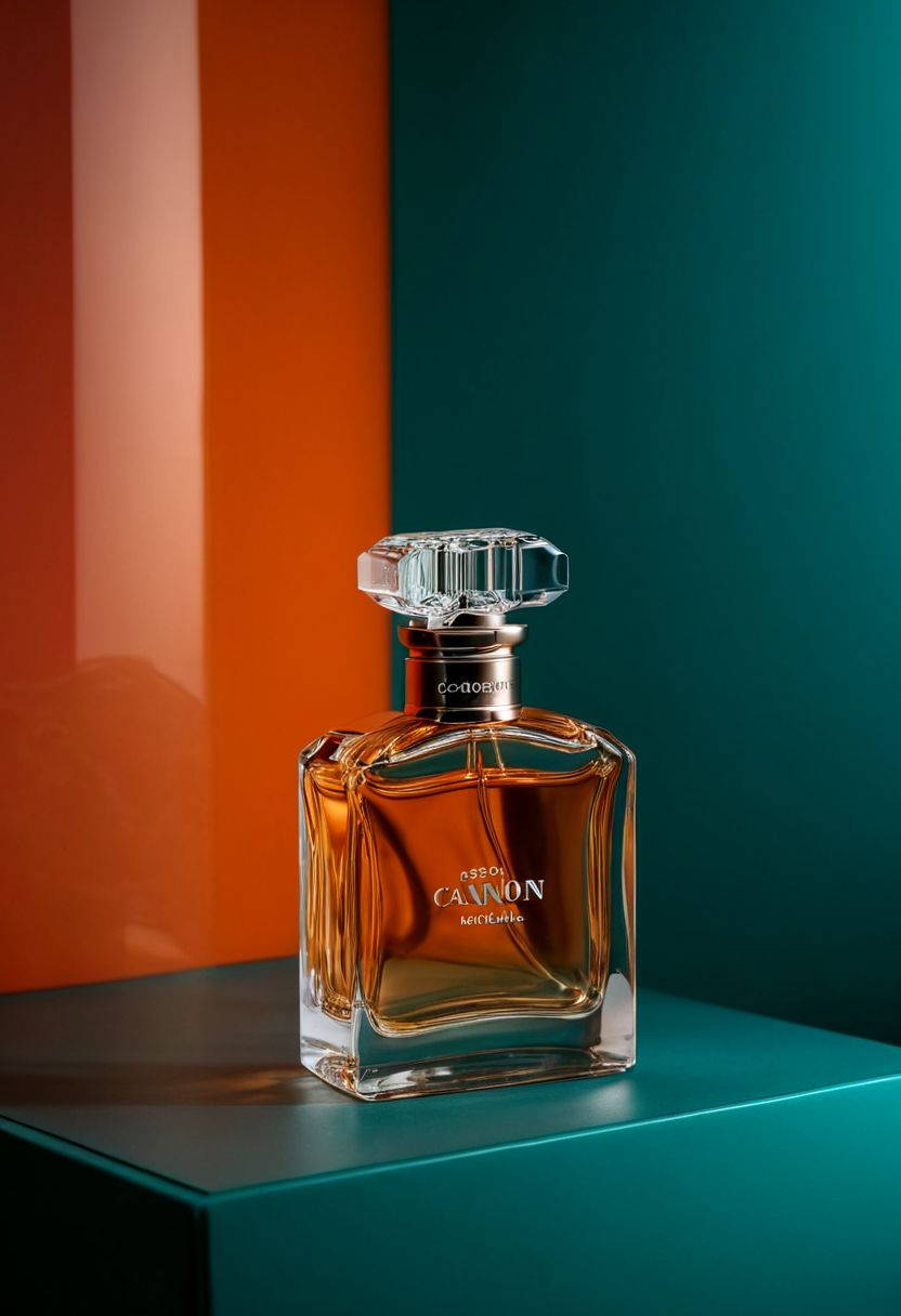 "Capture a luxurious perfume bottle against a bold backdrop of matte teal and vibrant orange panels. Use a Canon EOS R5 with a 50mm lens to highlight the striking dual-tone colors and elegant shape. Lighting enhances the color contrast, creating an energetic and captivating scene. The final photo showcases a unique blend of vibrant hues and elegant product design.