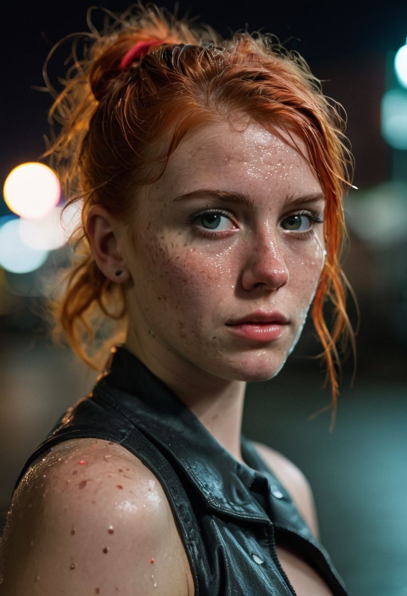 30 year old woman,black shirt,ginger with bright red hair, style by Dan Winters,RAW photography,film grain,(indistinguishable from reality:1.4),photo taken with a Bolex H16, Thorough,analog style,eye focus,highest quality,(highly detailed skin),perfect face,skin pores,(bokeh:0.6),sharp focus,dappled lighting,(backlighting:0.7),film grain,photographed on a Sony A7R IV,18mm F/1.7 cine lens,(highly detailed, intricately detailed),8k,HDR,front view,(upper body:0.9), Hyperrealistic art cinematic film still photography in the style of detailed hyperrealism photoshoot, "Streetpunk Sexy" - Visualize a portrait of a young woman on a city street. rainy night,The shot,taken from a distance,captures her (wet body:1.6) and indifferent expression in the midst of the urban night. with body sweat and wetness hinting at the city's humid atmosphere. messy hair,pigtails,candid pose,head tilt,The photo,taken with a Canon EOS 5D Mark III,showcases her natural skin texture,including subtle acne (0.3),in hyperrealistic detail under soft,sharp lighting. The depth of field focuses on her,against a backdrop of soothing,muted colors and high contrast,creating a dark,yet gorgeous (1.2) and immersive night scene.