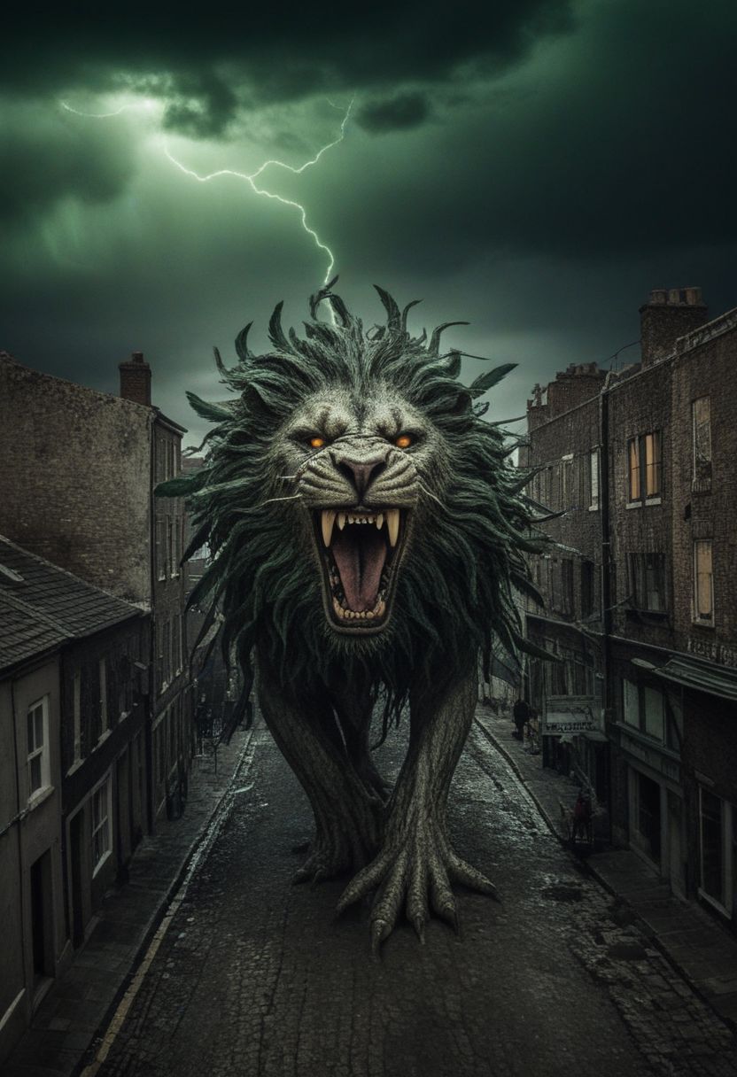[(very high angle photograph), (looking downward and across the scene)] , ((intense fisheyelens photograph)/(strong fishseyeview photograph)) of ((a dark, oppressive townscape) (in the centre is a giant, fearsome and grotesque figure), (the figure's face is like a fierce lion, with fiery, glaring eyes full of wrath and arrogance, its mouth, twisted in a perpetual snarl, reveals sharp, menacing teeth), (the figure's body is serpentine , long and coiled, covered in scales that shimmer with dark light), (the figure's body winds around jagged, rocky terrain, creating an eerie, labyrinthine environment)), ((at the edges of the townscape are other demons with distorted features, blending human and animalist elements, elongated limbs and sharp claws, wings with tattered feathers, and grotesque faces marked by blind, hollow eyes and twisted, cruel expressions)), ((in the distance, above the townscape, is a swirling vortex of dark clouds, occasionally pierced by flashes of sickly green lightning), (oppressive, chaotic)), intricate, detailed, echoimages, ((long exposure motion photos) overlayed on (sharp short exposure )), (strange afterimages), (multiple exposures), ((low opacity, Lovecraftian double exposure overlays), experimental angles, contrasting lighting and shadows, epiCNegative, epiCRealism,