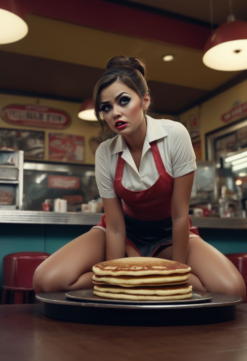 Horror-themed cinematic film still of a beautiful 60s diner waitress that is shrunk and sitting on top of a giant pancake with legs down, highly detailed, best quality, insanely detailed,extremely fine details, realistic shaded lighting, visually striking, dramatic, sharp focus, 8K, variety of small details in the background, masterpiece, perfect result, ultra hd, LUT 35mm film filter, highly detailed, UHD perfect composition, beautifully detailed, 8k art photography, epic, perfect light, soft natural volumetric cinematic