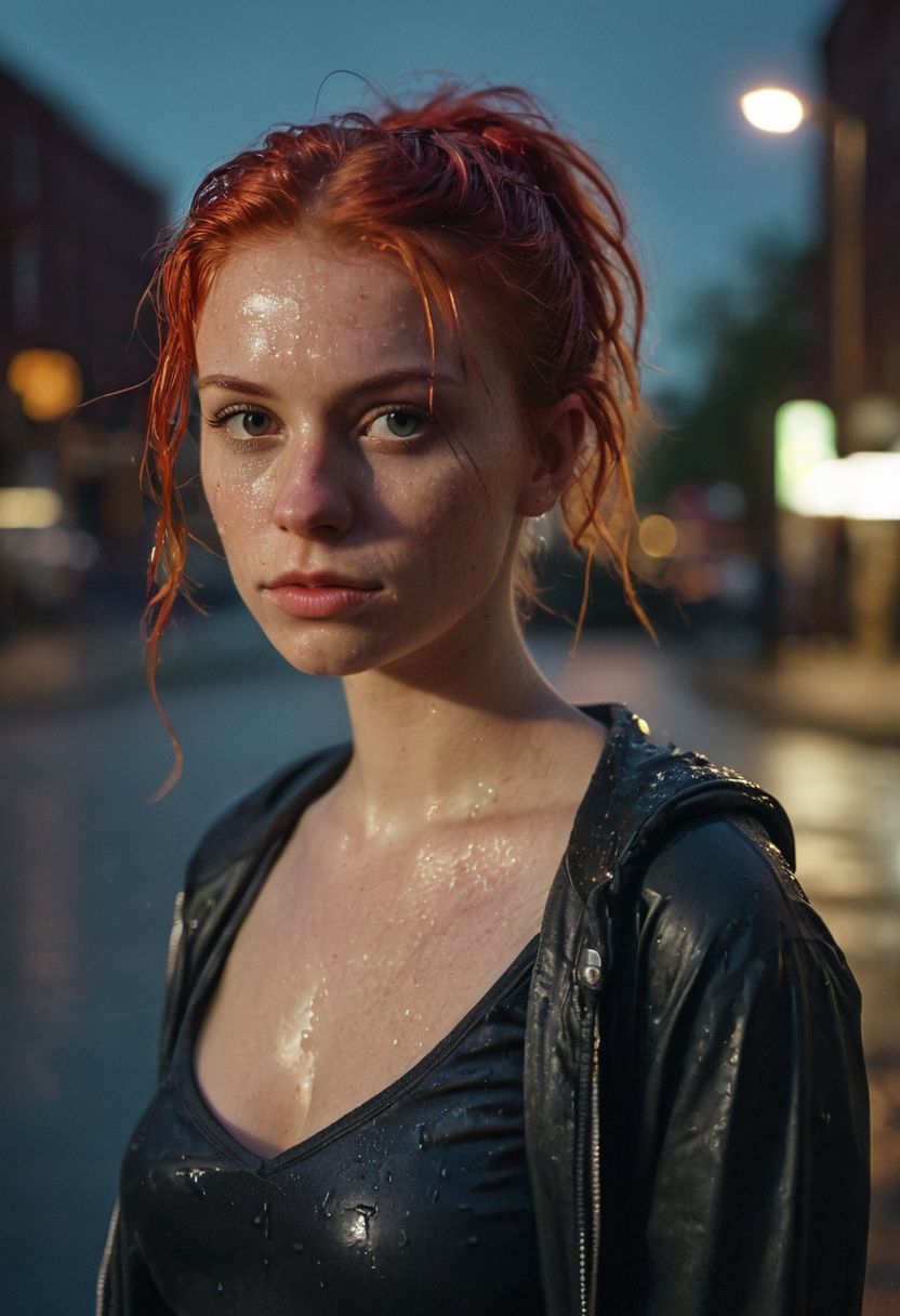 30 year old woman,black shirt,ginger with bright red hair, style by Dan Winters,RAW photography,film grain,(indistinguishable from reality:1.4),photo taken with a Bolex H16, Thorough,analog style,eye focus,highest quality,(highly detailed skin),perfect face,skin pores,(bokeh:0.6),sharp focus,dappled lighting,(backlighting:0.7),film grain,photographed on a Sony A7R IV,18mm F/1.7 cine lens,(highly detailed, intricately detailed),8k,HDR,front view,(upper body:0.9), Hyperrealistic art cinematic film still photography in the style of detailed hyperrealism photoshoot, "Streetpunk Sexy" - Visualize a portrait of a young woman on a city street. rainy night,The shot,taken from a distance,captures her (wet body:1.6) and indifferent expression in the midst of the urban night. with body sweat and wetness hinting at the city's humid atmosphere. messy hair,pigtails,candid pose,head tilt,The photo,taken with a Canon EOS 5D Mark III,showcases her natural skin texture,including subtle acne (0.3),in hyperrealistic detail under soft,sharp lighting. The depth of field focuses on her,against a backdrop of soothing,muted colors and high contrast,creating a dark,yet gorgeous (1.2) and immersive night scene.