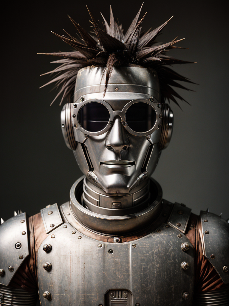 (art by Mons Desiderio:0.9), photograph, Long exposure of a Cold Han Dynasty Cyberman, Entrancing hair styled as Spiky, Evil Glasses, Intellectual crazy eyes, shallow depth of field, Ultrarealistic, dramatic lighting, film grain, Fuji superia 400, 35mm