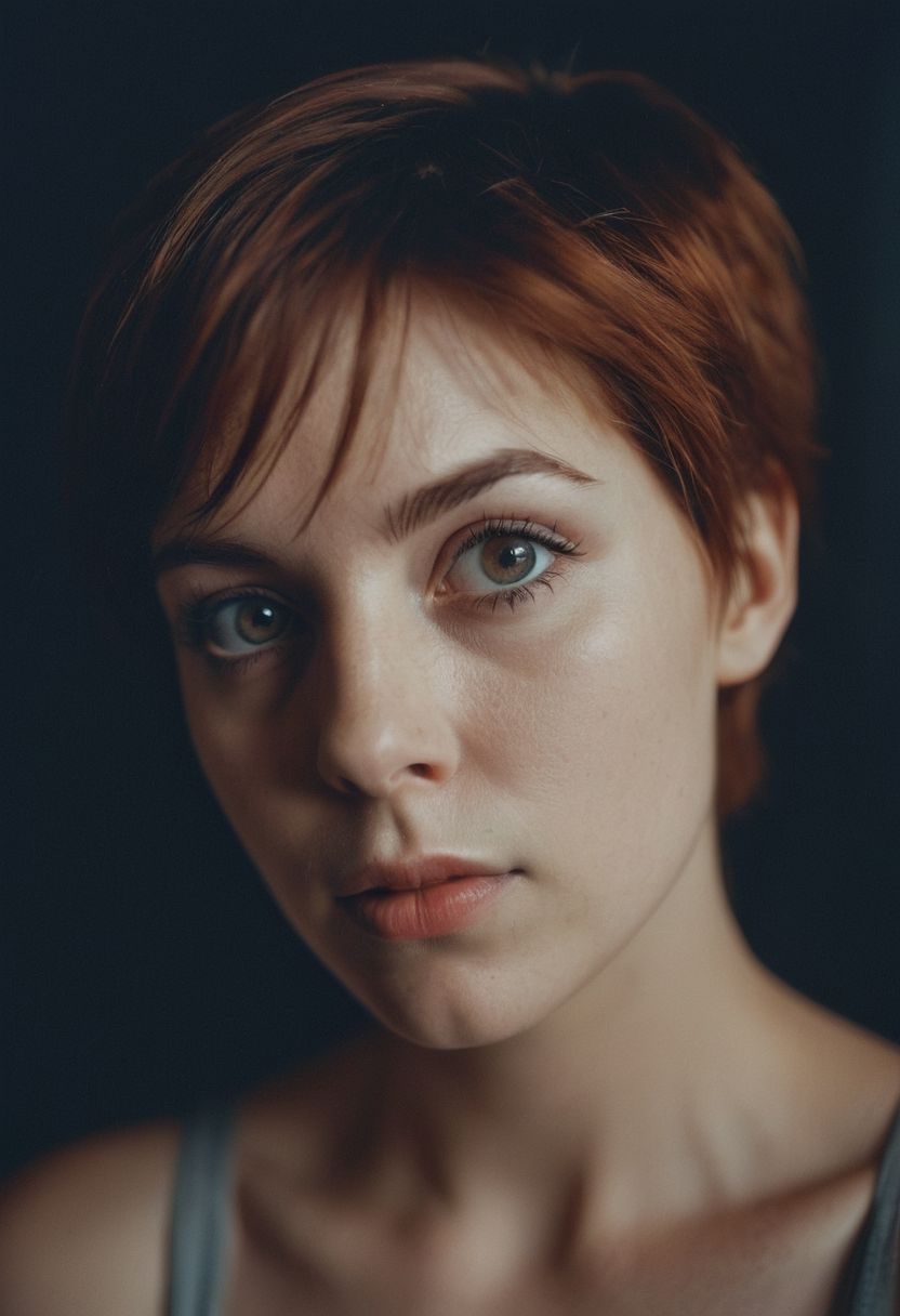 photoshoot, photo studio, RAW photo, editorial photograph, film stock photograph, cinematic, posing, amateur photo, analog, raw, f2, 35mm, an (amateur photo), flash photography, taken on an old camera, polaroid, 8k, highly detailed, (high quality, best quality:1.3), Extremely high-resolution, film grain, Sandra from Germany, long (waist-length:1.2) pixie cut auburn hair, ((macro lens)), dark atmosphere, ((focused on eyes)), feminine expressions, photography, dslr, 35mm, Fujifilm Superia Premium 400, Nikon D850 film stock photograph, Kodak Portra 400 f1.6 lens, 8k, UHD