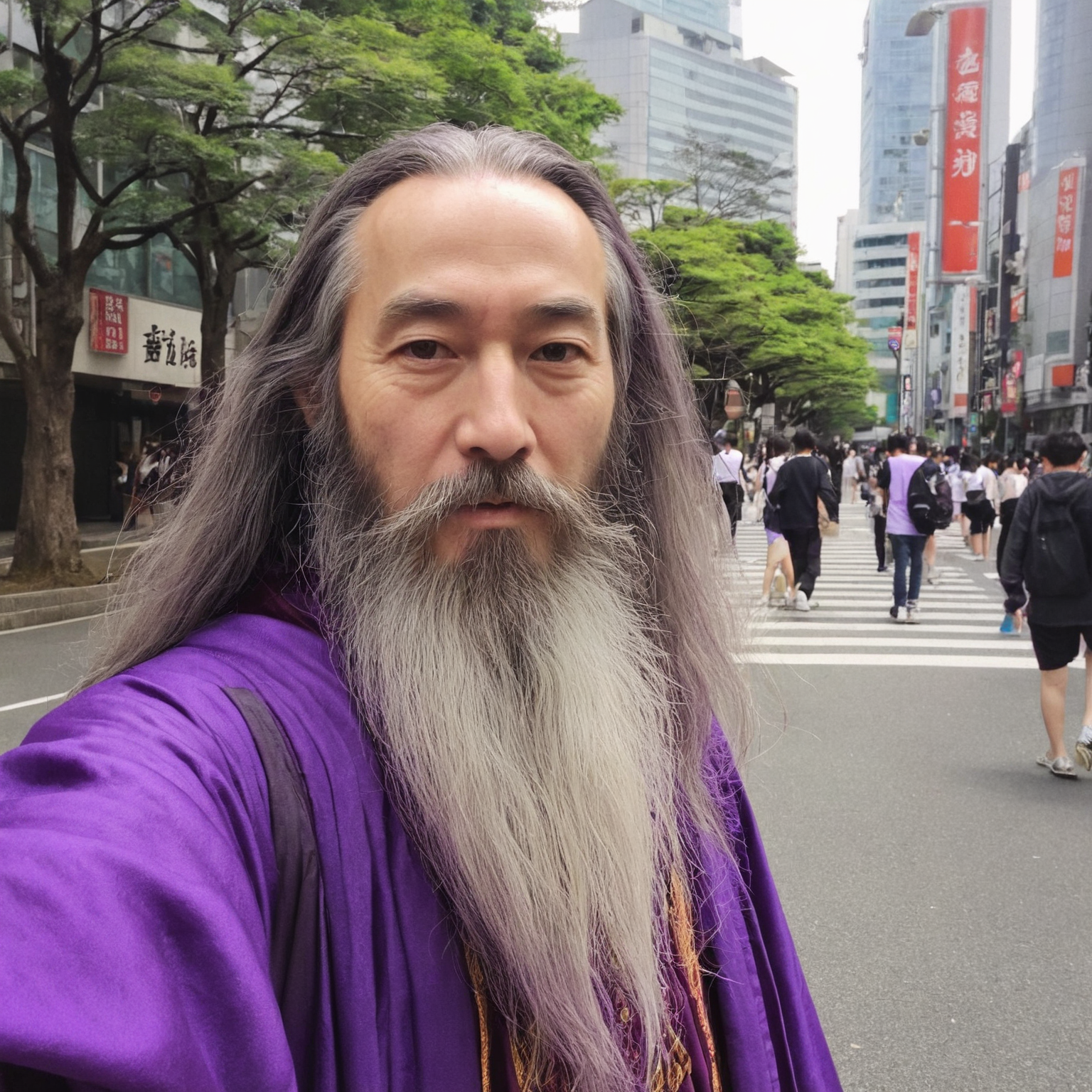 selfie photo of a wizard with long beard and purple robes, he is apparently in the middle of Tokyo. Probably taken from a phone.