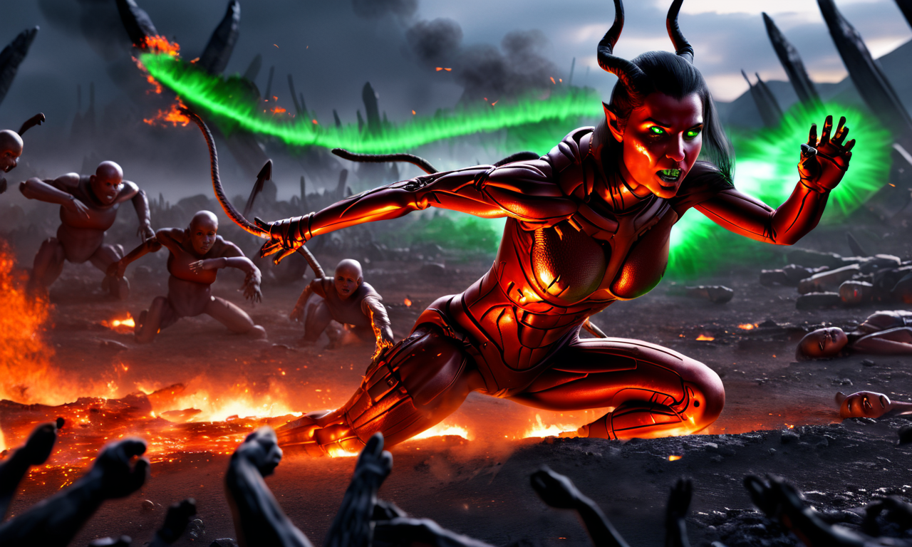 <lora:bionic armor style:1>, <lora:Demon Girl:1> Demon style, (masterpiece), (beautiful), (photorealistic), (high quality), (highest details), (cinematic film), A 1girl, on a battlefield with corpses, with fire on hand, wearing a Nanosuits style armor, roaring on human bodies, green glowing eyes, red skin.